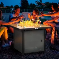 Outsunny 31.5″ Gas Fire Pit Table With Glass Rocks, Glass Wind Guard, Waterproof Cover, 50,000 BTU Fire Table, Brown