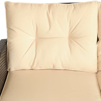 Our 4-piece patio furniture set brings indoor comfort to your backyard. Everything is there: a loveseat, two armchairs, and a two-tier coffee table. Enjoy the perks of home, like tilted tufted backrest cushions, a place to put drinks, and softly padded seats in the great outdoors. Always have room for surprise guests, and spend more time outside. Our PE wicker patio furniture was handwoven, offering a classic rattan style with all-weather resistance. Get out, get comfy, and get Outsunny.