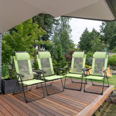 Let the day’s stress drift away on an Outsunny reclining chair. These chairs fold and recline to five different positions for relaxation on the go. They’re highly breathable, strong, and weather resistant with a mix of mesh and Oxford fabrics. Whether you use them as pool chairs, lounge chairs, camping or beach chairs, when you’re ready to come inside, they fold, so you can easily store them away. Get out, get comfy, get Outsunny.